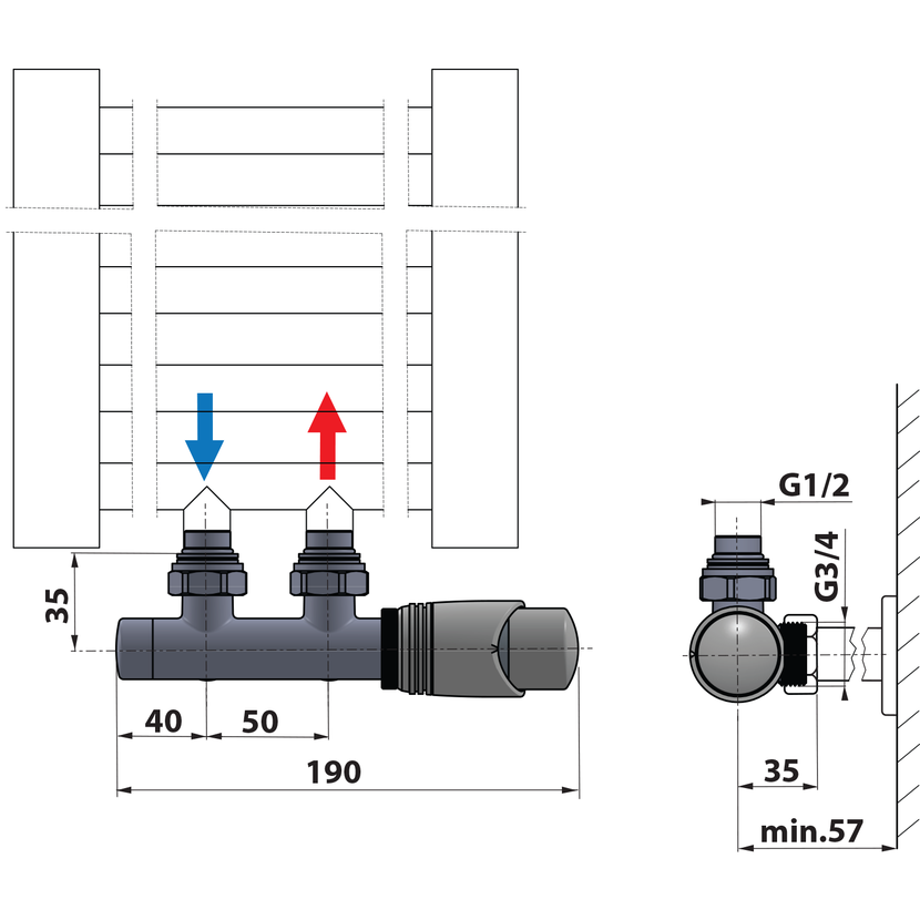 VýbavaTermostat, hlavice vlevo, Termostat, hlavice vpravo, Středové 50 mm